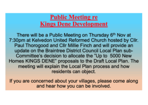There will be a Public Meeting at 7:30pm in the Church hosted by Cllr Paul Thorogood and Cllr Milli Finch concerning the KINGS DENE development for a proposed 5000 new homes between Kelvedon, Coggeshall and Rivenhall.