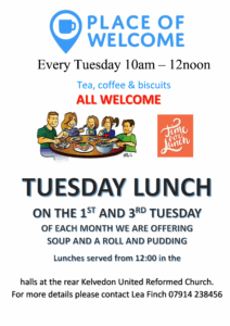 Tuesday Lunches: Our Warm Welcome Hub Space Tuesday Lunches are starting again this year on the 1st and 3rd Tuesday each month starting from Tuesday 7th October with Lunches served from 12:30pm. Please contact Lea Finch on 07914 238456 for more details and to book your place. Everyone is welcome to come and join us.